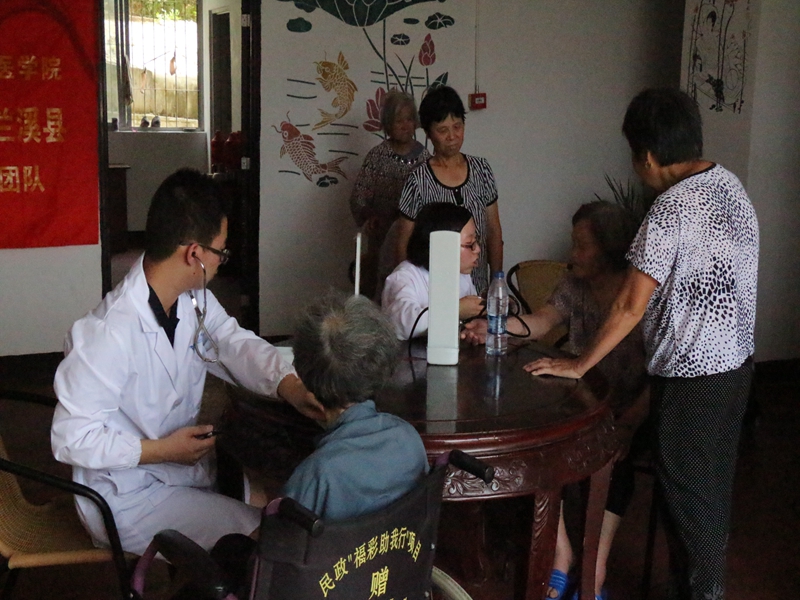 与前一天在塘上村以及塘下村给老人量血压所得情况相比,这里的老人血压普遍较为正常,这让我们一行人感到非常安心。在按摩方面,同学们仔细地询问老人们哪里有酸痛感,从而有重点地进行按摩。介于有些老人的身板较为瘦弱,同学们在按摩的时候都会注意轻重,尽量不让老人感到不舒服。按摩过程中,也有颐养中心里的陪护人员和同学们探讨怎样给老人更好地按摩,大家相互交流着,气氛轻松而愉悦。按摩其实挺累人的,又在高温天气下,不多时,同学们穿在白大褂里的T恤就被汗水沾湿了。有同学额头上的汗水也不小心滴到老人身上,正尴尬着,老人们也看出了同学们的辛苦,用温润的方言叮嘱我们可以慢慢来,不要太累,还有一位腿脚不便的老奶奶一直想要给我们搬椅子让我们休息一会儿,这些让我们在异乡金华兰溪感受到了浓浓的长辈关怀。对于我们尚未能回答出老人的部分问题,老人们还鼓励我们要学习得更好,我们倍受鼓舞。量完血压和按摩后,我们和老人们聊起家常,虽然语言不是很通,但我们还是很顺利地聊了下来,因为大家都是用心在沟通。当然,因为方言不是很懂,我们经常会错意,还闹出了不少笑话,逗得老人们呵呵大笑.
