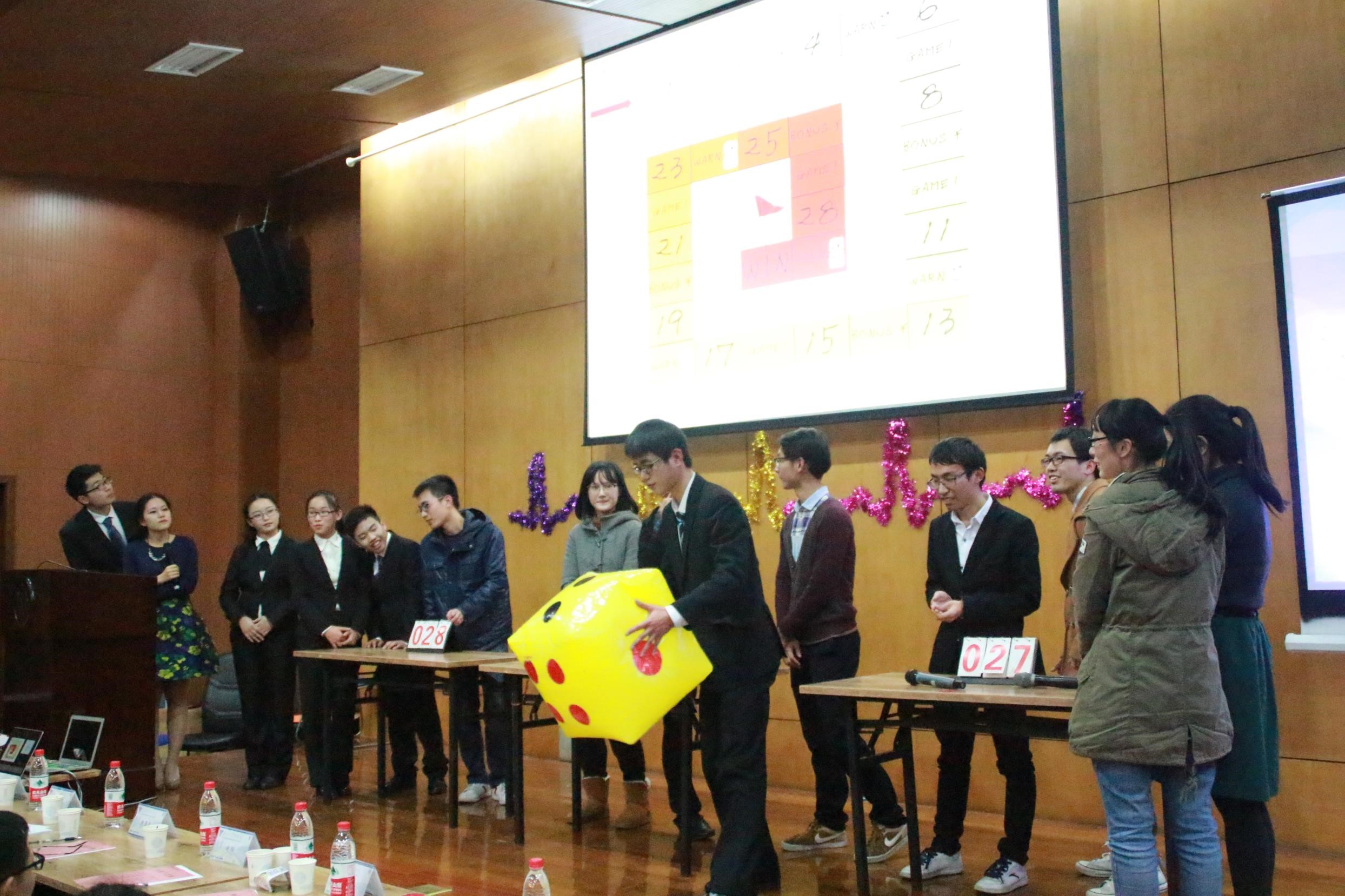 经过舞台剧和必答题环节,得分最高的临床1302班、临床1305班、临床1306班进入最终的大富翁角逐。地图上一共有三种格子,普通格、情景格和游戏格。每次掷完色子前进相应步数后,都需要回答一道题目。若踩中情景格,则按照情景前进或后退一格。若一只队伍踩到游戏格,三支队伍一起进行游戏,优胜的队伍得5分。有队伍到达终点后,游戏结束。