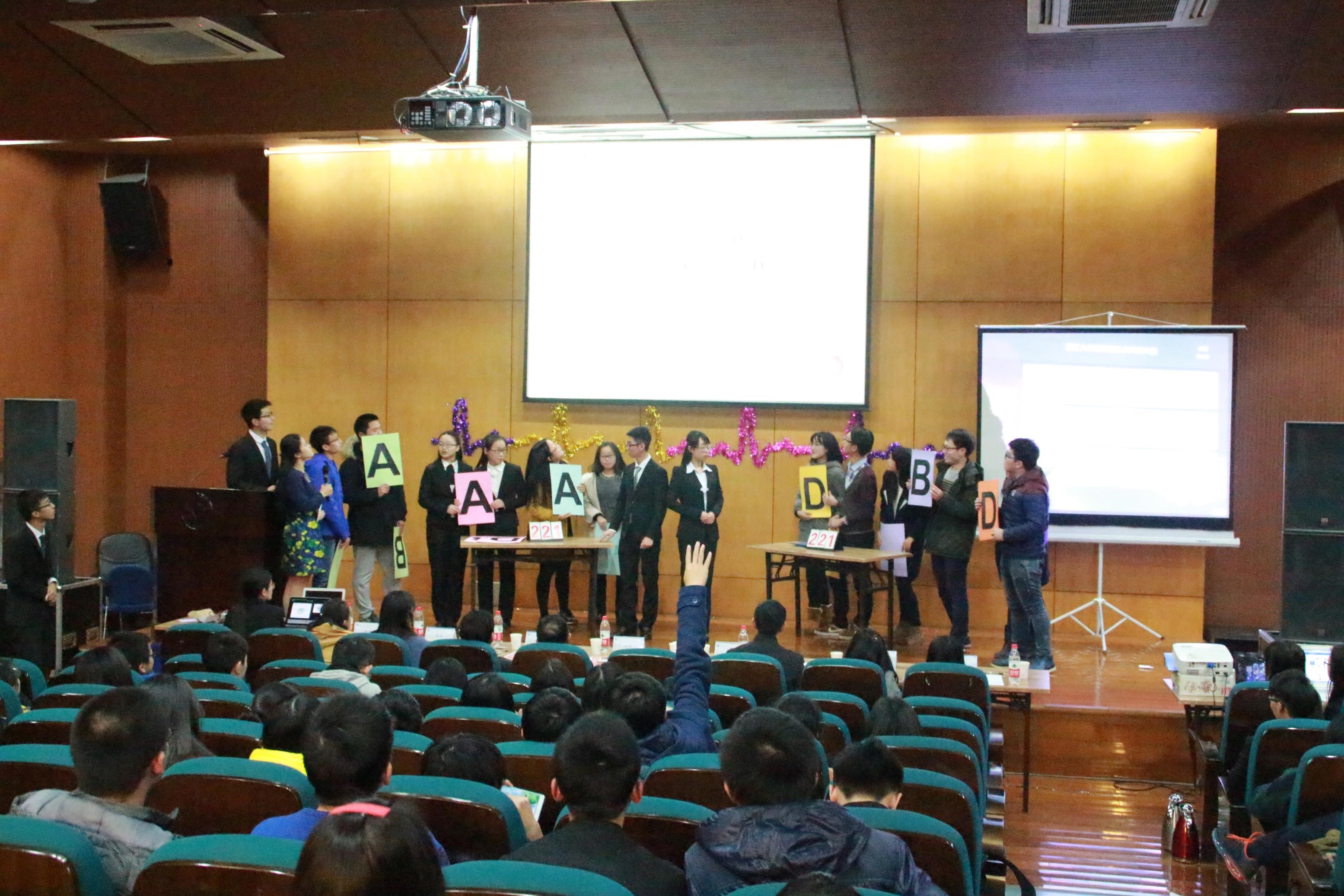随着最后一个班舞台剧的落幕,很快就进入了必答题环节。相较前一轮风采展示环节,必答题的作答更稳扎稳打地考察选手们的知识水平,也更加能拉开队伍之间的分差。12支队伍分为两批,每队选两位同学代表该队上台竞技,答题开始后,大屏幕上显示出题目,主持人读完题目10秒后6支队伍同时亮出答案,场面颇为壮观。
