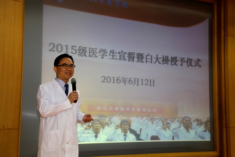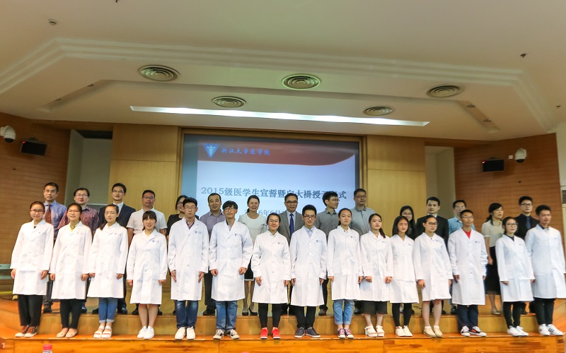 2016年6月12日晚,医学院2015级医学生宣誓暨白大褂授予仪式在紫金港校区蒙民伟楼225报告厅隆重举行。医学院副院长、附属第一医院院长、2015级新生之友代表王伟林教授、医学院党委副书记陈周闻老师、医学院团委/学工办、教学办相关老师、班主任和2015级全体医学生一起出席了本次活动。仪式由学工办副主任杜悦主持。