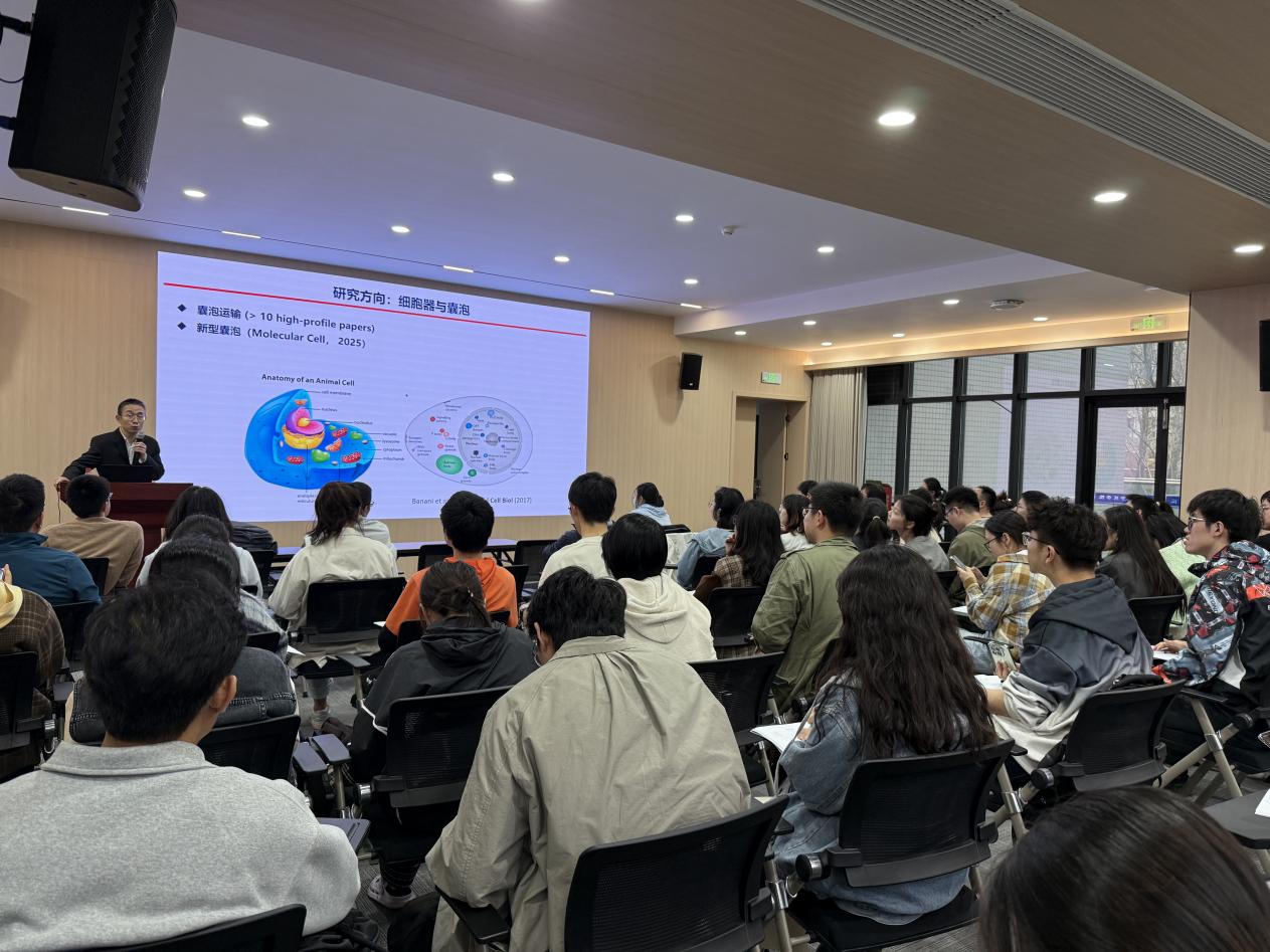 贾教授团队综合利用细胞生物学、生物化学、蛋白质组学、斑马鱼与小鼠模型等多种手段,研究细胞器的动态调控、囊泡运输及相关神经系统疾病的致病机制,并开发治疗手段。在本次报告开始之际,贾教授向大家提出了囊泡运输领域的“哲学三问”:囊泡是什么?囊泡从哪里来?囊泡要到哪里去?围绕这三个基本的科学问题,贾教授向在场的师生们分享了他的团队近年来的研究工作进展:他们发现了囊泡运输过程中首个可以识别特定货物蛋白基序的囊泡栓系复合物并阐明了潜在的分子调控机理,他们首次揭示了代谢物β-羟基丁酸可以通过诱导线粒体囊泡的形成调控线粒体的质量控制并在酒精诱导的肝损伤中发挥一定的保护作用。